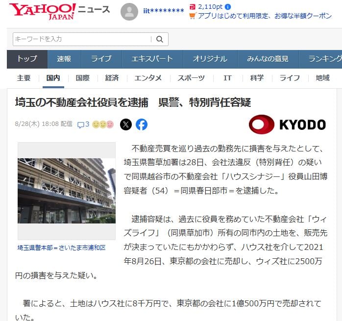 現在は越谷市の不動産会社社長さん)が逮捕されたそうですが、